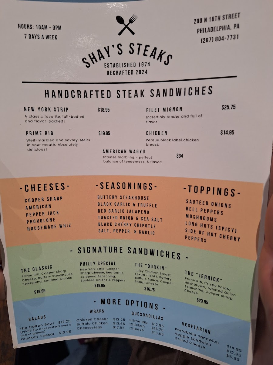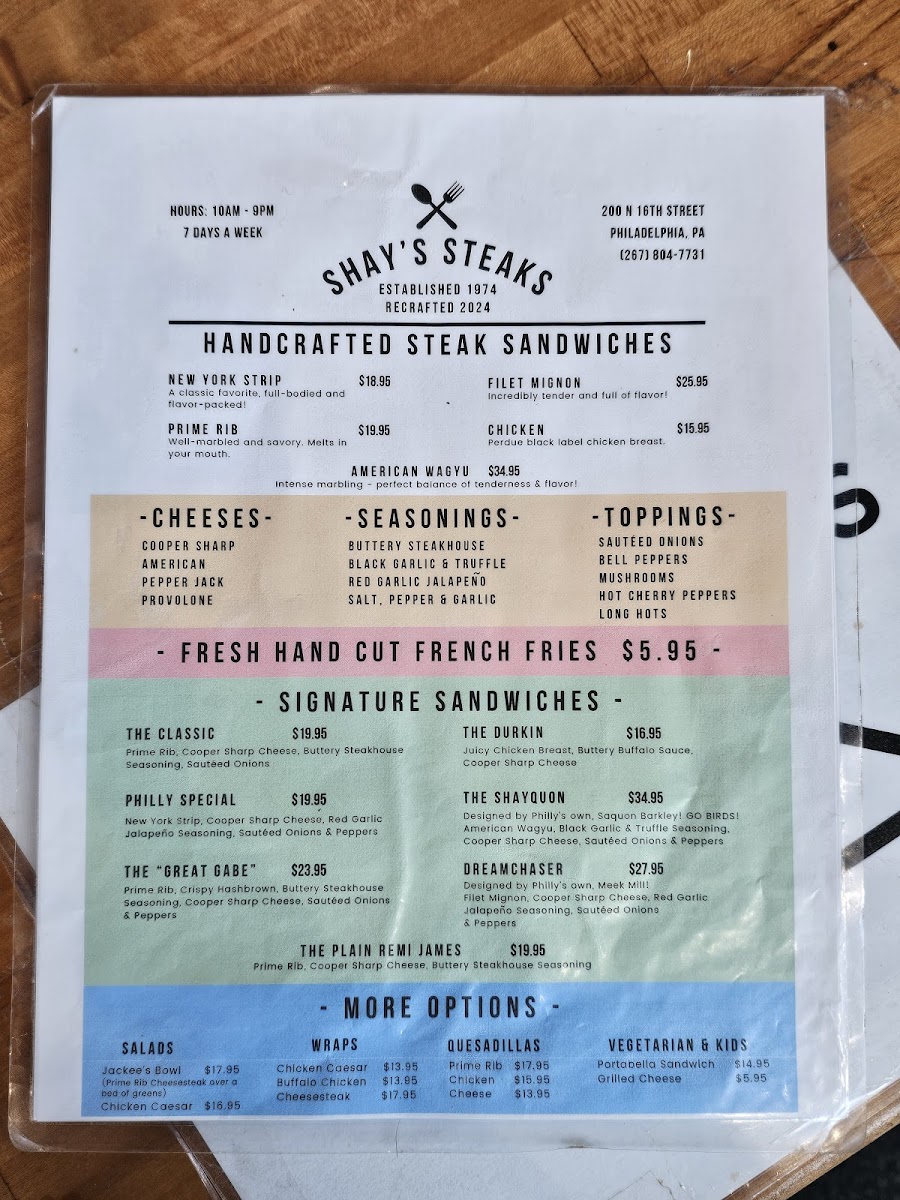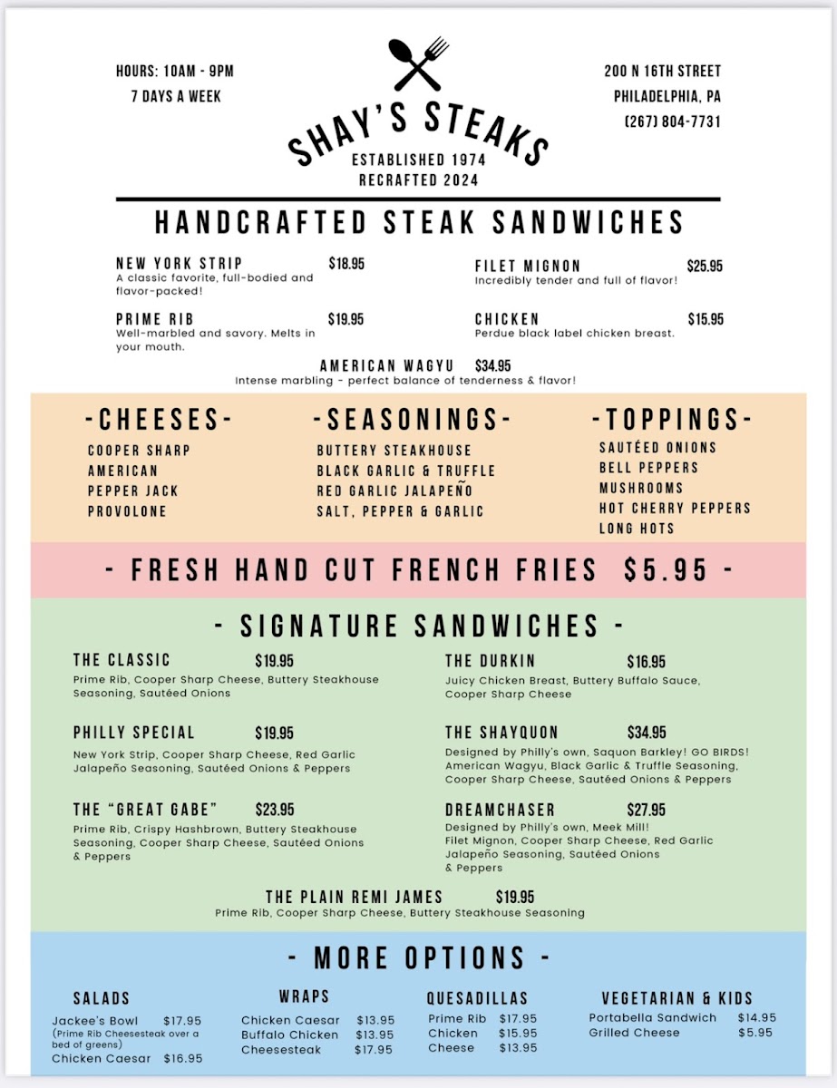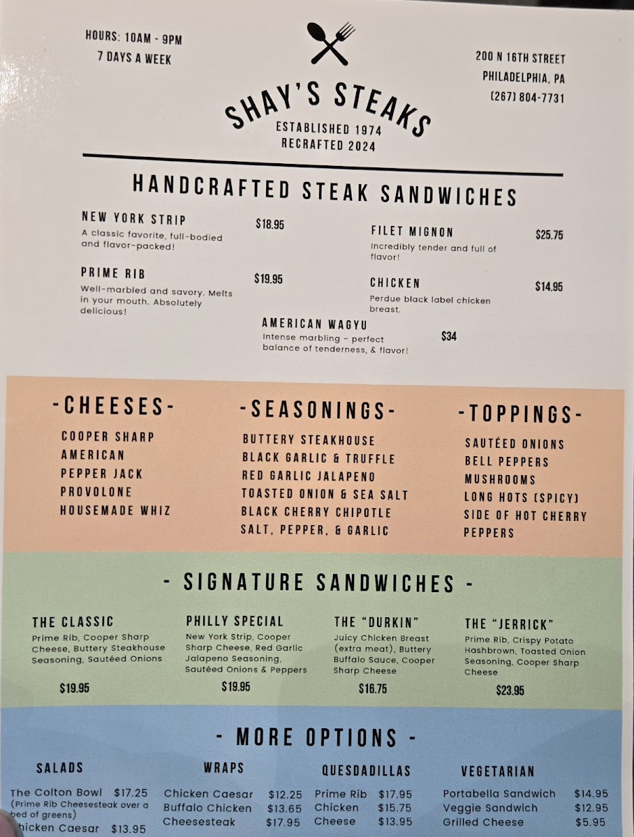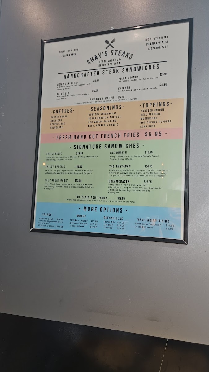 If you're craving a delicious, hearty meal in the heart of Philadelphia, Shay’s Steaks Menu has exactly what you need. Located at 200 N 16th St, this spot is perfect for steak lovers looking to dive into mouth-watering options. The menu offers a variety of perfectly seasoned steaks, all cooked to your preference, and each bite will leave you coming back for more. From classic cuts to specialty creations, there's something here to satisfy every craving.