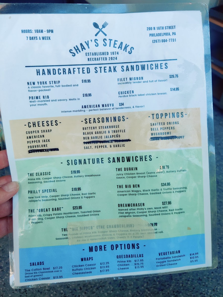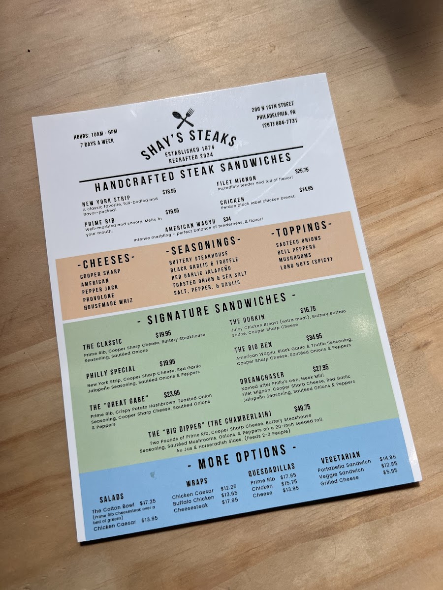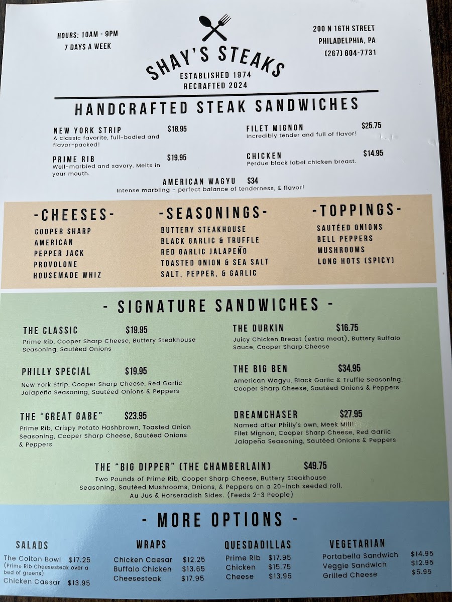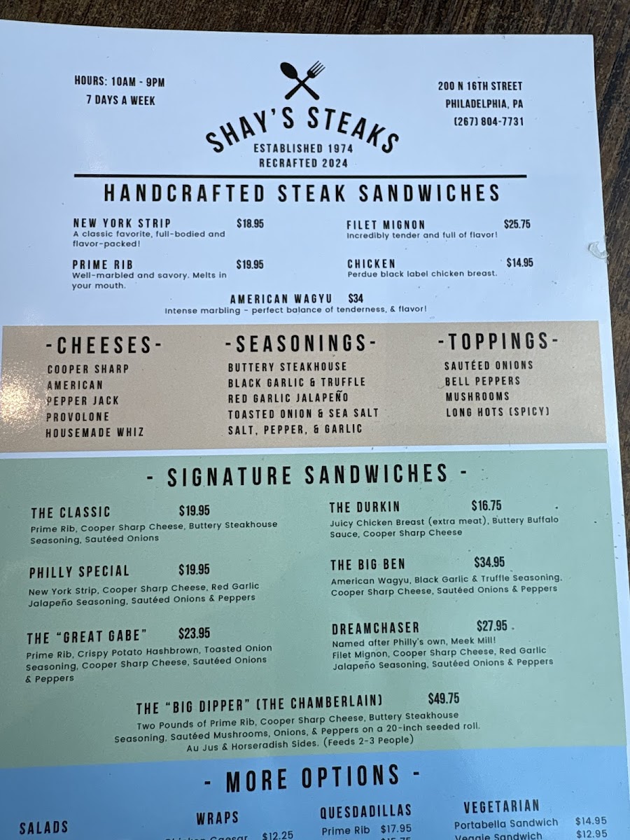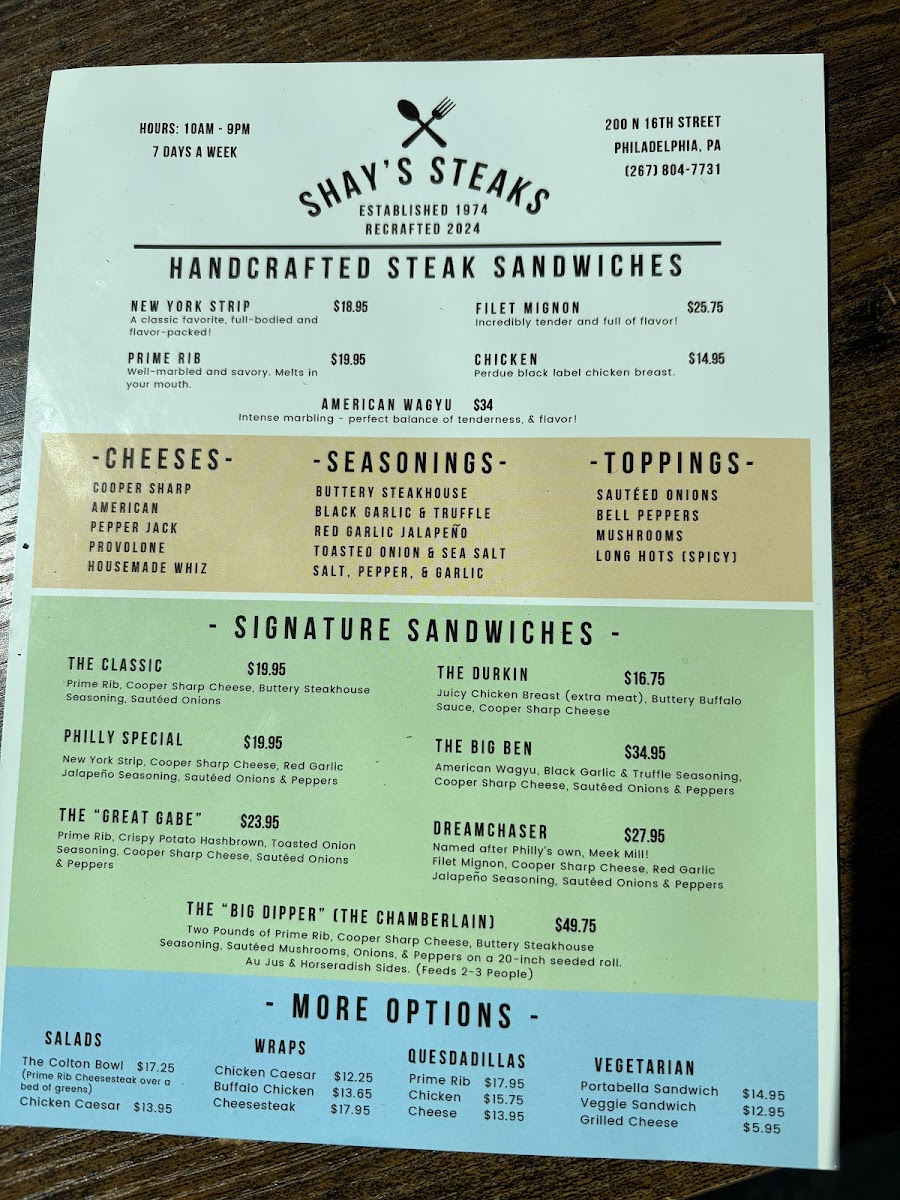 If you're craving a delicious, hearty meal in the heart of Philadelphia, Shay’s Steaks Menu has exactly what you need. Located at 200 N 16th St, this spot is perfect for steak lovers looking to dive into mouth-watering options. The menu offers a variety of perfectly seasoned steaks, all cooked to your preference, and each bite will leave you coming back for more. From classic cuts to specialty creations, there's something here to satisfy every craving.